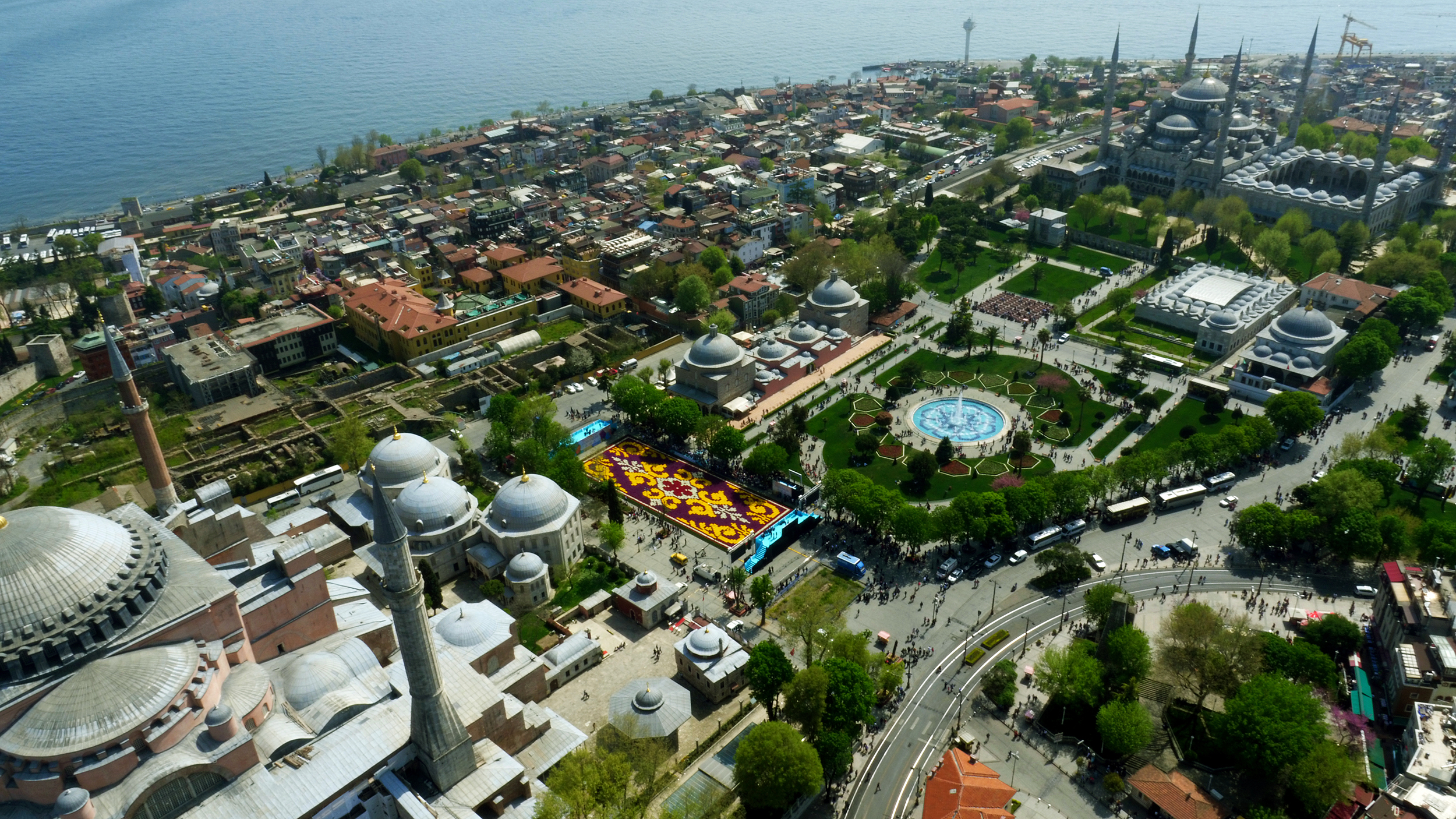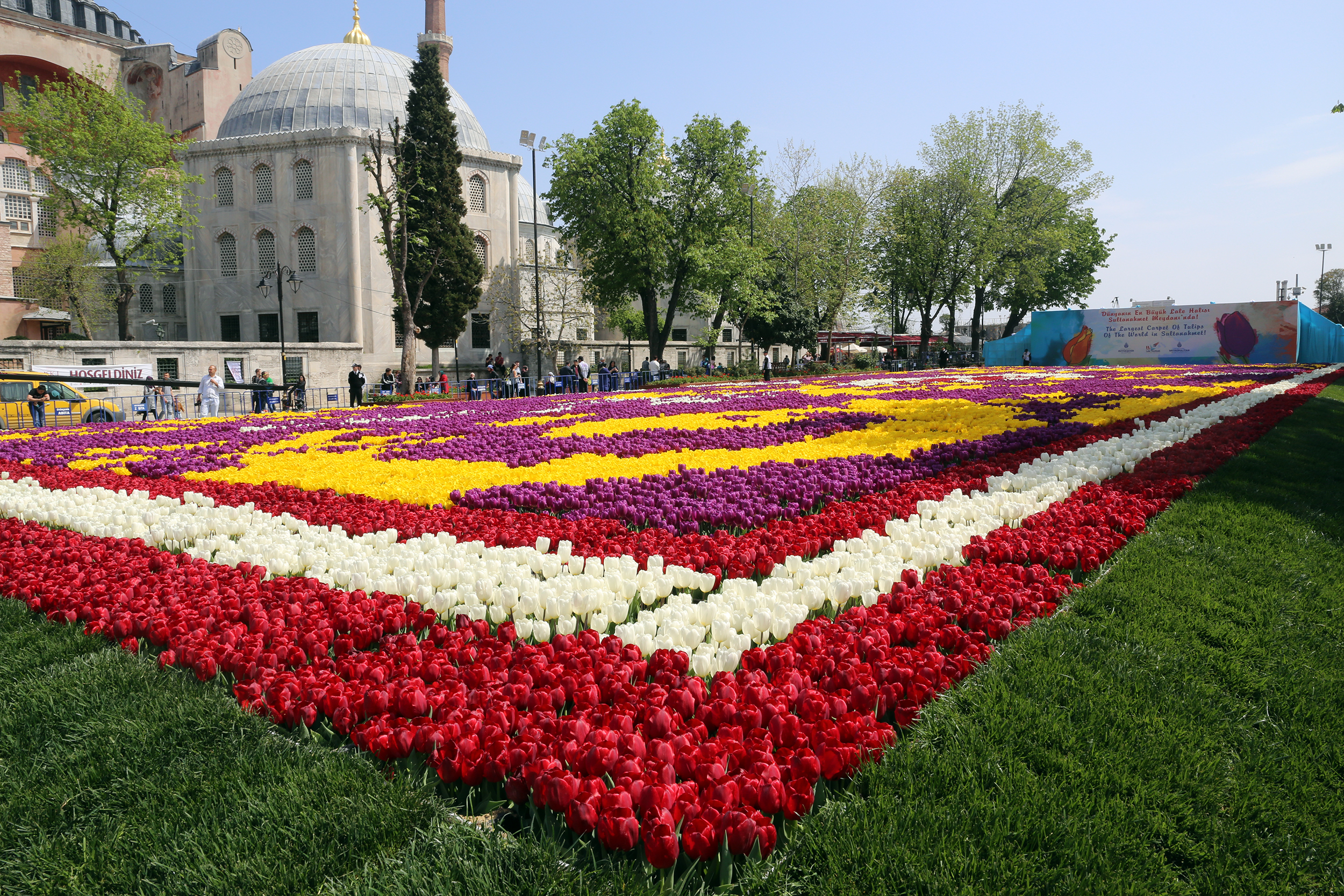 Для ковра в османском стиле, общей площадью 728 квадратных метров, понадобилось 563 000 белых, желтых, красных и фиолетовых тюльпанов. Полюбоваться этой грандиозной клумбой в виде ковра можно на площади Султанахмет, рядом с собором Святой Софии.