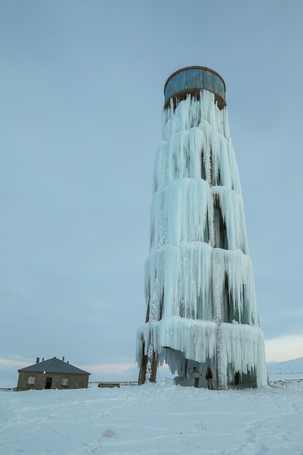 Водонапорная башня высотой 20 метров в районе Сарыкёй провинции Ван не выдержала 20-градусных морозов и дала трещину, а вытекшая из нее вода замерзла, придав сооружению причудливые формы.