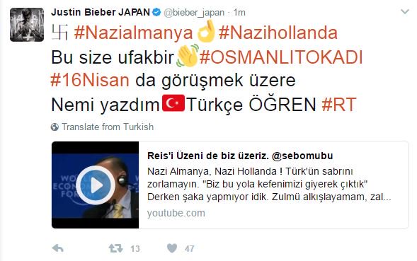 Сообщения содержат изображения свастики и хэштеги «нацистская Германия» и «нацистские Нидерланды», а также видеозапись с отрывками из выступлений президента Турции Тайипа Эрдогана.