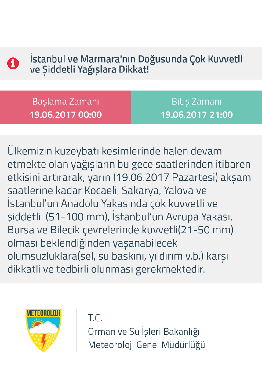 Главное управление метеорологии Турции (MGM) выпустило 19 июня предупреждение о надвигающемся сильном ливне на весь регион Мраморного моря, включая Стамбул.