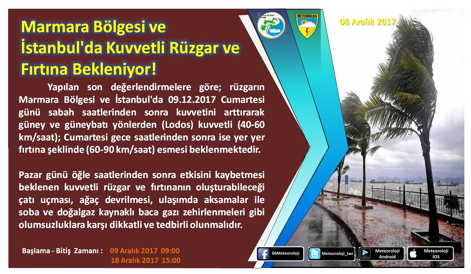 Главное управление метеорологии Турции (MGM) опубликовало предупреждение по региону Мармара, в том числе и для Стамбула, где в субботу ожидается шторм и ураганный ветер.