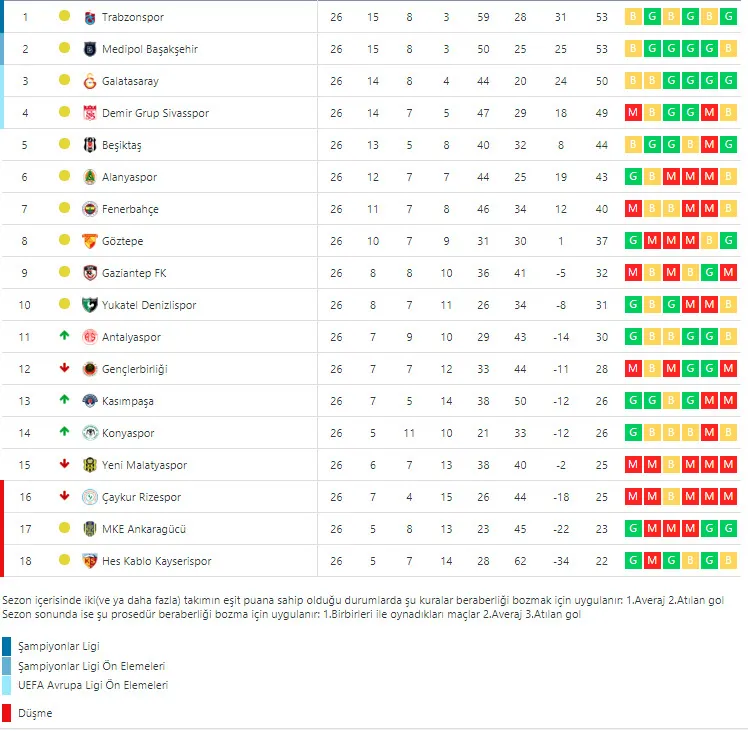 На момент остановки чемпионата из-за пандемии коронавируса после 26-ти туров в Суперлиге Турции лидеров двое: Трабзонспор и Башакшехир набрали по 53 очка.