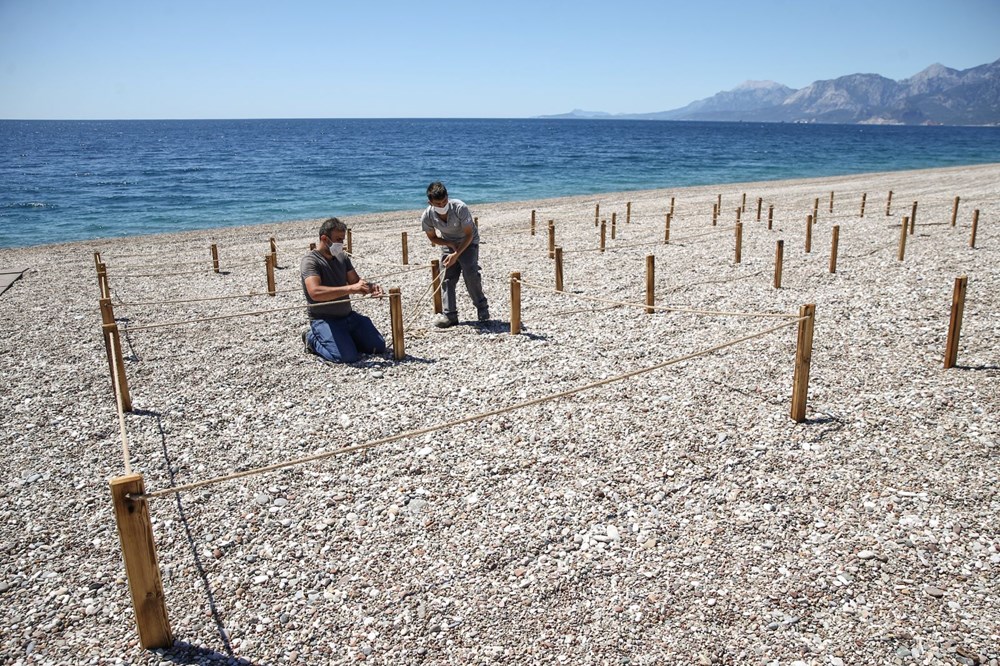 Если в парках Измира на траве были нарисованы круги для определения безопасной дистанции, то на пляже Коньяалты создали квадратики, где разместят шезлонги и зонтики.