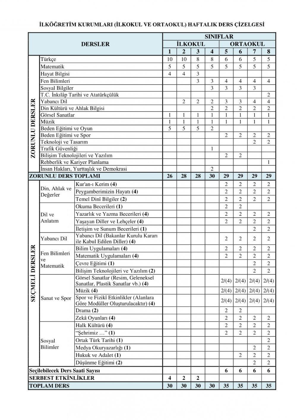 Турецкий язык, науки о жизни, математика, естественные науки, общественные науки, история реформ и кемализма, религиозная культура, иностранный язык, а также профильные предметы (для 8-х и 12-х классов).