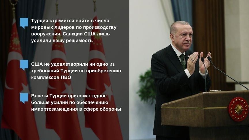 «Истинная причина давления США на Анкару – пресечение развития турецкого оборонного комплекса, превращение Турции в зависимую страну в сфере военных поставок. Мы приложим вдвое больше усилий по увеличению импортозамещения в сфере обороны. Турция стремится войти в число мировых лидеров по производству вооружения. Санкции США лишь усилили нашу решимость», — заявил глава государства.