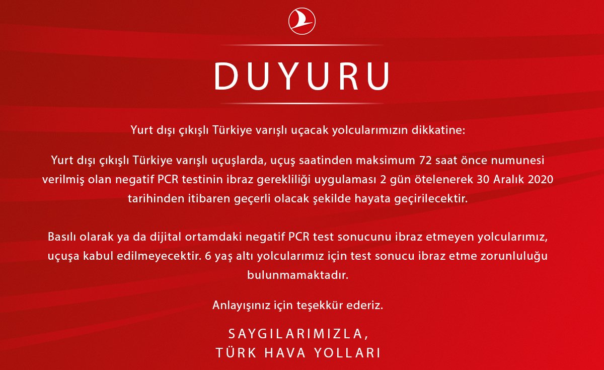 Глава национального авиаперевозчика Turkish Airlines Билял Экши сообщил приятную новость для тех, кто не успевает сделать обязательный для прилета в Турцию тест на коронавирус до 28 декабря.