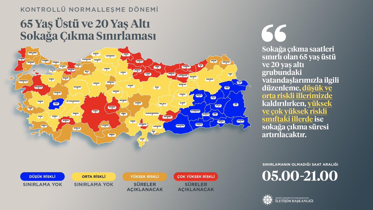 Президент Эрдоган объявил вчера, что в провинциях с низким и средним уровнем риска заражения ограничения для пожилых людей 65+ и молодежи будут сняты.