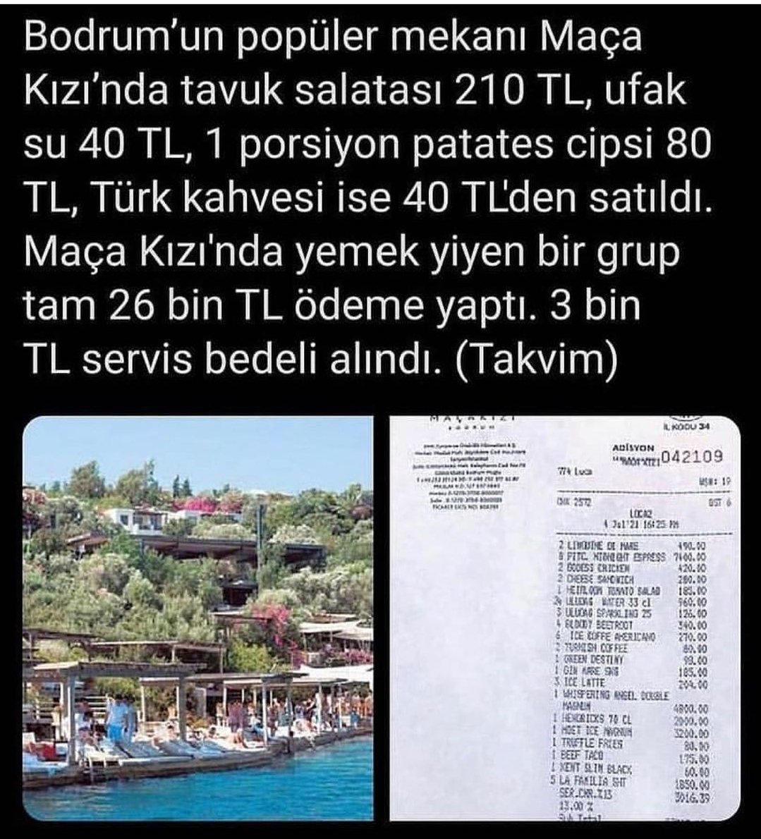 В этом году в руки журналистов попал счет на 26 тысяч лир из пляжного ресторана Macakizi, расположенного в одноименном 5-звездочном отеле в курортном поселке Гёльтюрбюкю неподалеку от Бодрума. Волна недовольства такими заоблачными ценами после публикации в СМИ прокатилась по комментариям во всех социальных сетях.