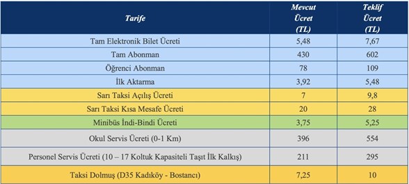 Помимо того под 40-процентную надбавку стоимости попали и проездные карты, в том числе одноразовый электронный билет (tam elektronik bilet), цена которого выросла с 5,48 до 7,67 лир. Месячный проездной (Mavi Kart) подорожал с 430 лир до 602 лир, ученический месячный проездной с 78 до 109 лир. Стоимость первой пересадки также выросла с 3,92 до 5,48 лир.