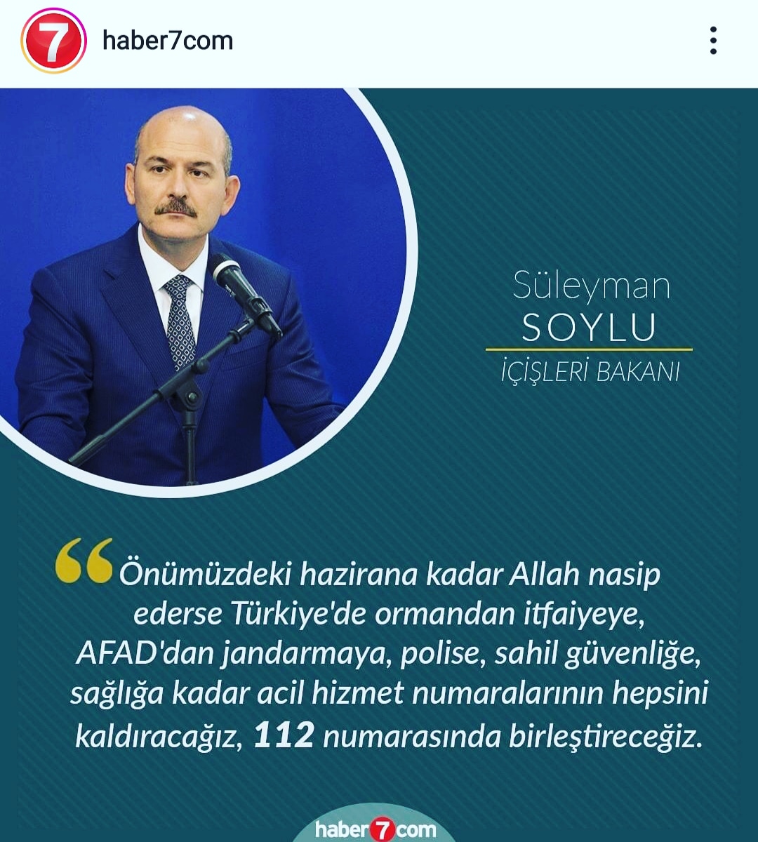 По заявлению главы МВД, все 81 провинция Турции должны полностью перейти на единый номер спасения 112 к июню 2021 года.