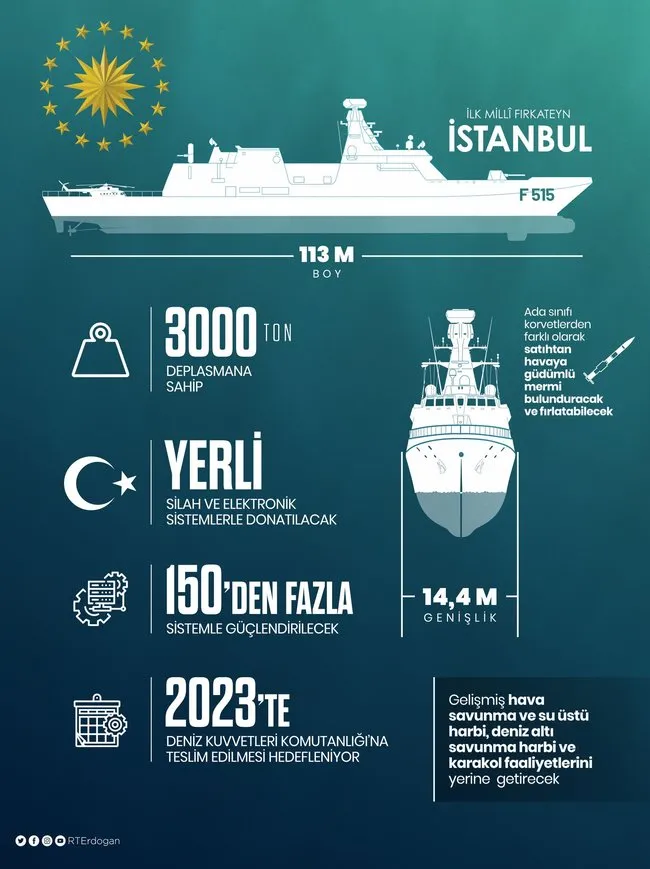 В субботу на стамбульской верфи при участии президента Реджепа Тайипа Эрдогана состоялась церемония спуска на воду первого отечественного фрегата — «Стамбул» (Istanbul / F-515).
