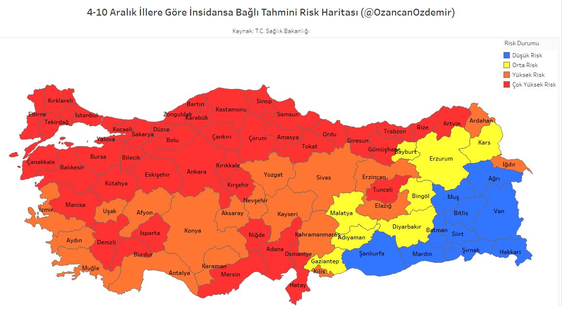 Как показывают опубликованные в субботу министром данные, в Турции с 4 по 10 декабря число провинций с низким (синим) уровнем заражения выросло до 10: Хаккяри, Батман, Муш, Ван, Ширнак, Агры, Мардин, Битлис, Шанлыурфа и Сиирт. Средний (желтый) уровень зафиксирован также только в восточных провинциях: Малатья, Адыяман, Газиантеп, Эрзурум, Диярбакыр, Байбурт, Бингёль и Карс.