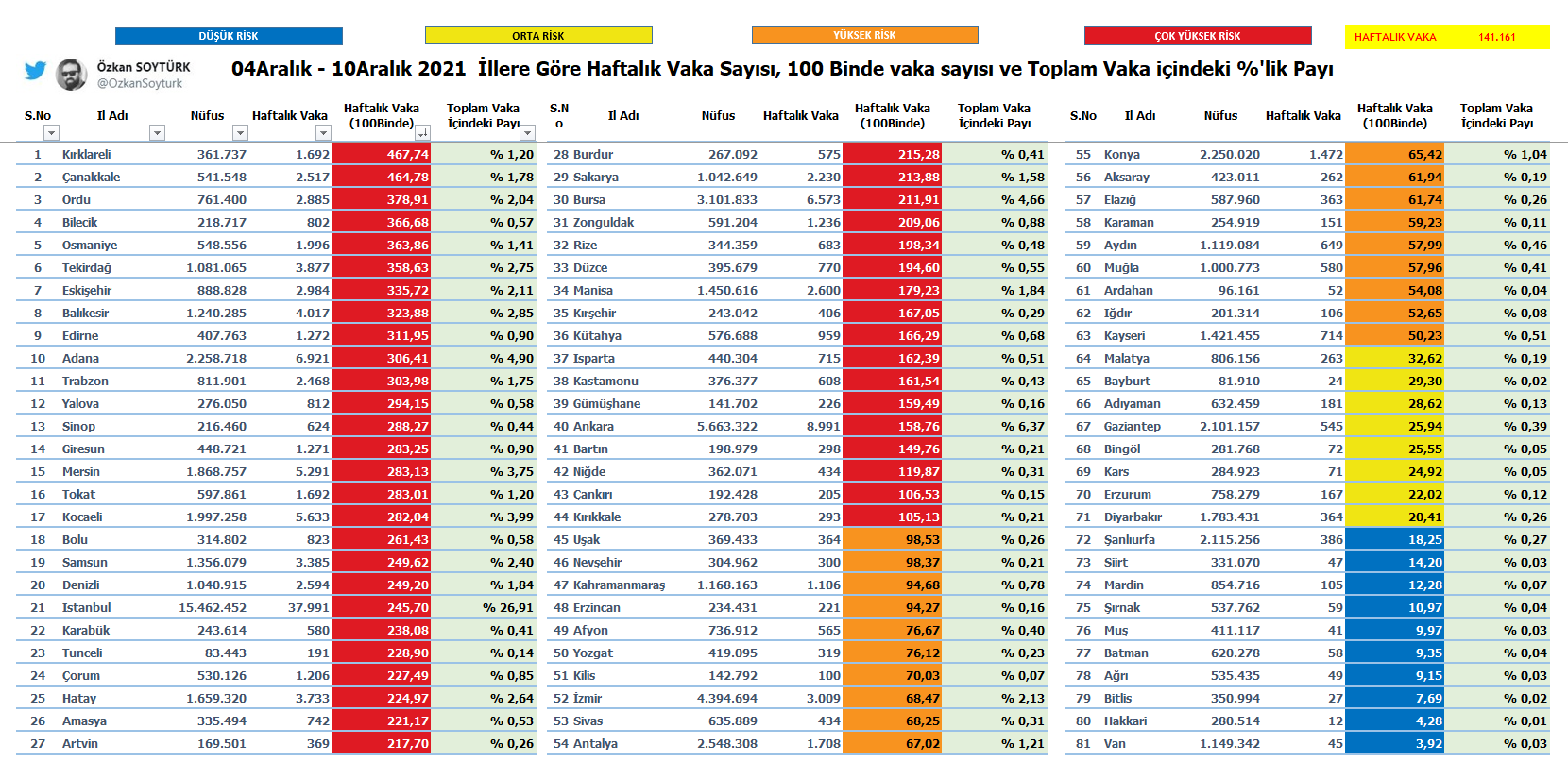 4-10 Aralık arasında vaka yoğunluğu bir önceki haftaya göre en çok artan 9 ilimiz: Edirne, Artvin, Tekirdağ, Ordu, Trabzon, Kırklareli, Yozgat, Rize, Isparta. pic.twitter.com/oEerZPLSs6