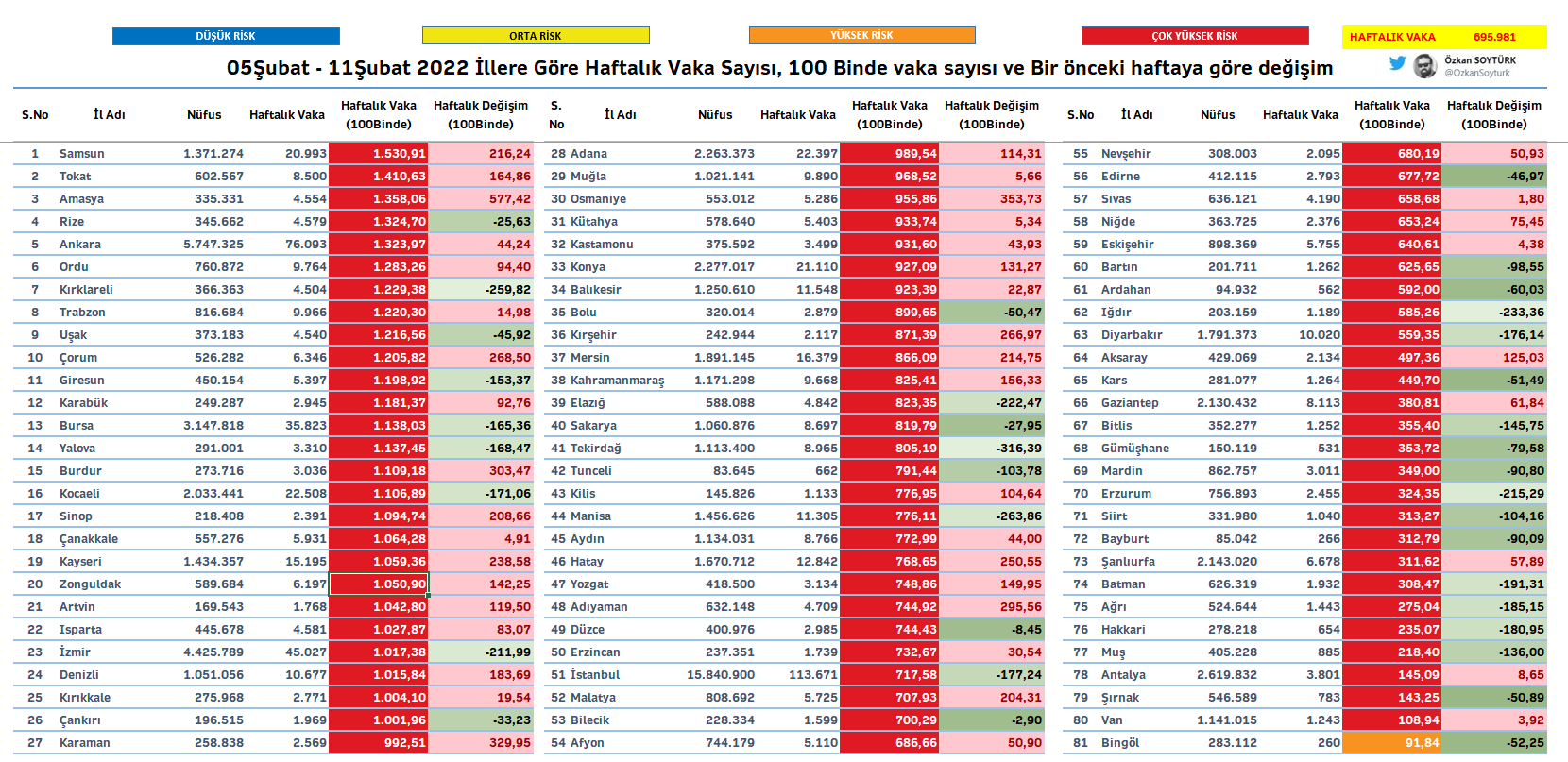 Глава турецкого Минздрава Фахреттин Коджа в Твиттере поделился с общественностью картой с обновлённой недельной статистикой количества заражений на 100 тысяч населения по каждой из 81 провинции.